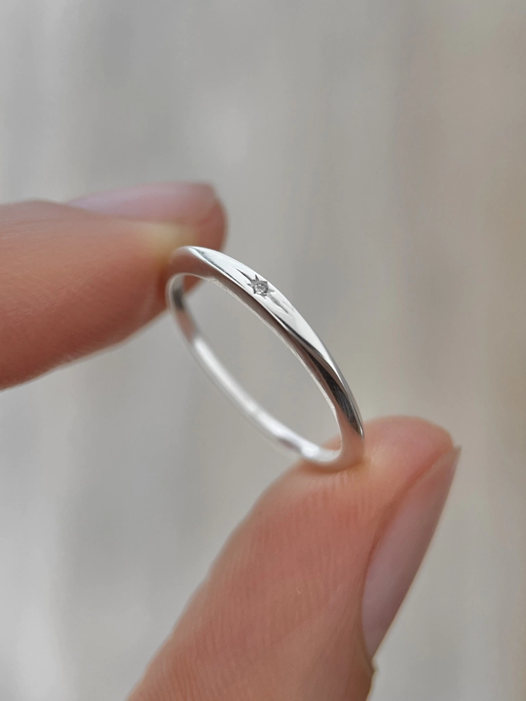 Anel liso em fio meia cana, prata maciça, parte interna reta e externa abaulada. O topo do anel é plano com uma estrela talhada com cravação ponto luz de uma pedra zircônia no centro. Perfeito para ser usado como aliança.