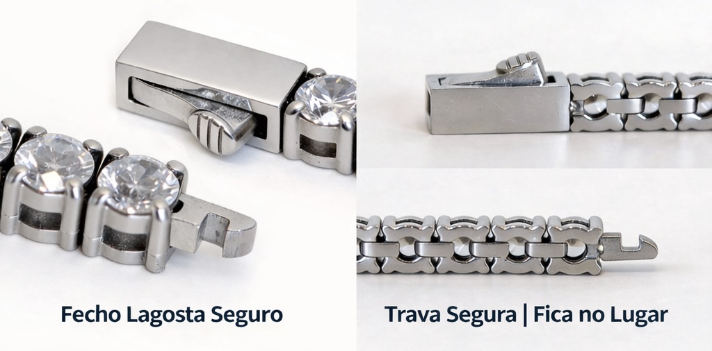 Material reconhecido por sua alta durabilidade e resistência, sendo perfeito para uso diário, chuveiro, mar, piscina. O aço 316L não escurece, não desbota, é livre de metais pesados, sendo seguro para peles sensíveis.