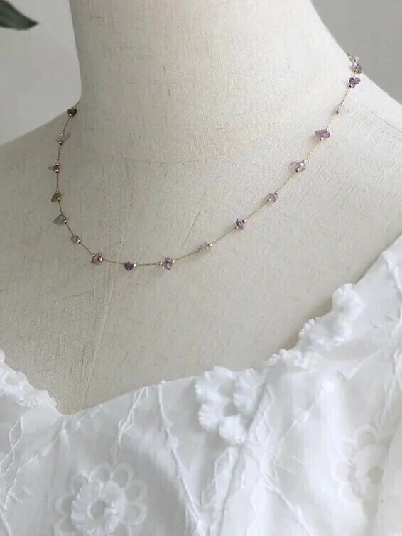 Corrente delicada de elos, com contas irregulares de pedra natural Ametista.