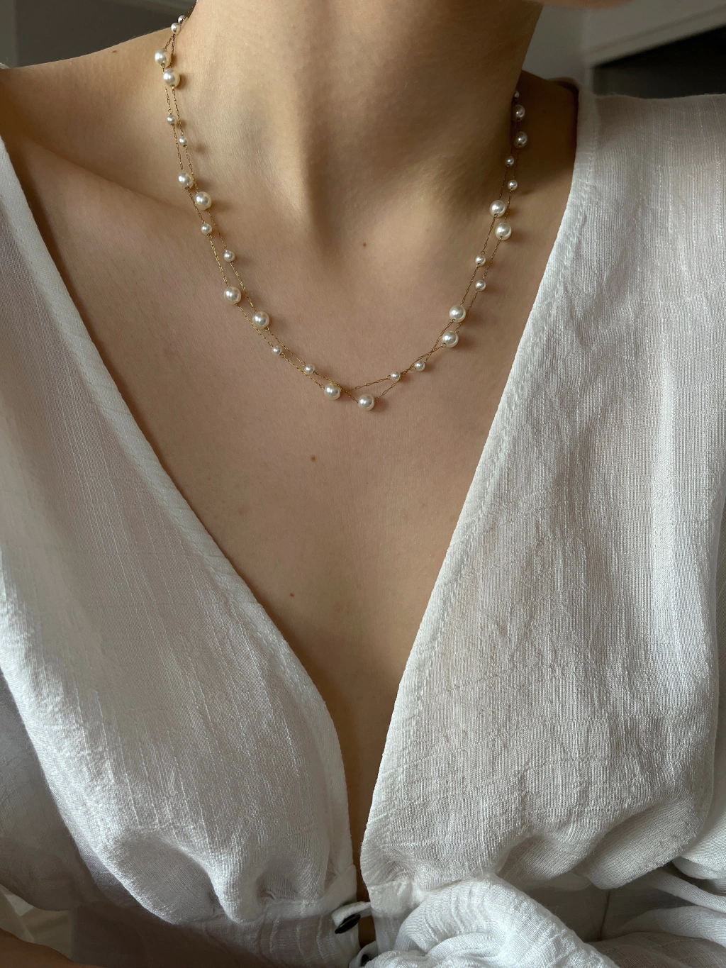 Corrente delicada de elos com contas de pérolas sintéticas.