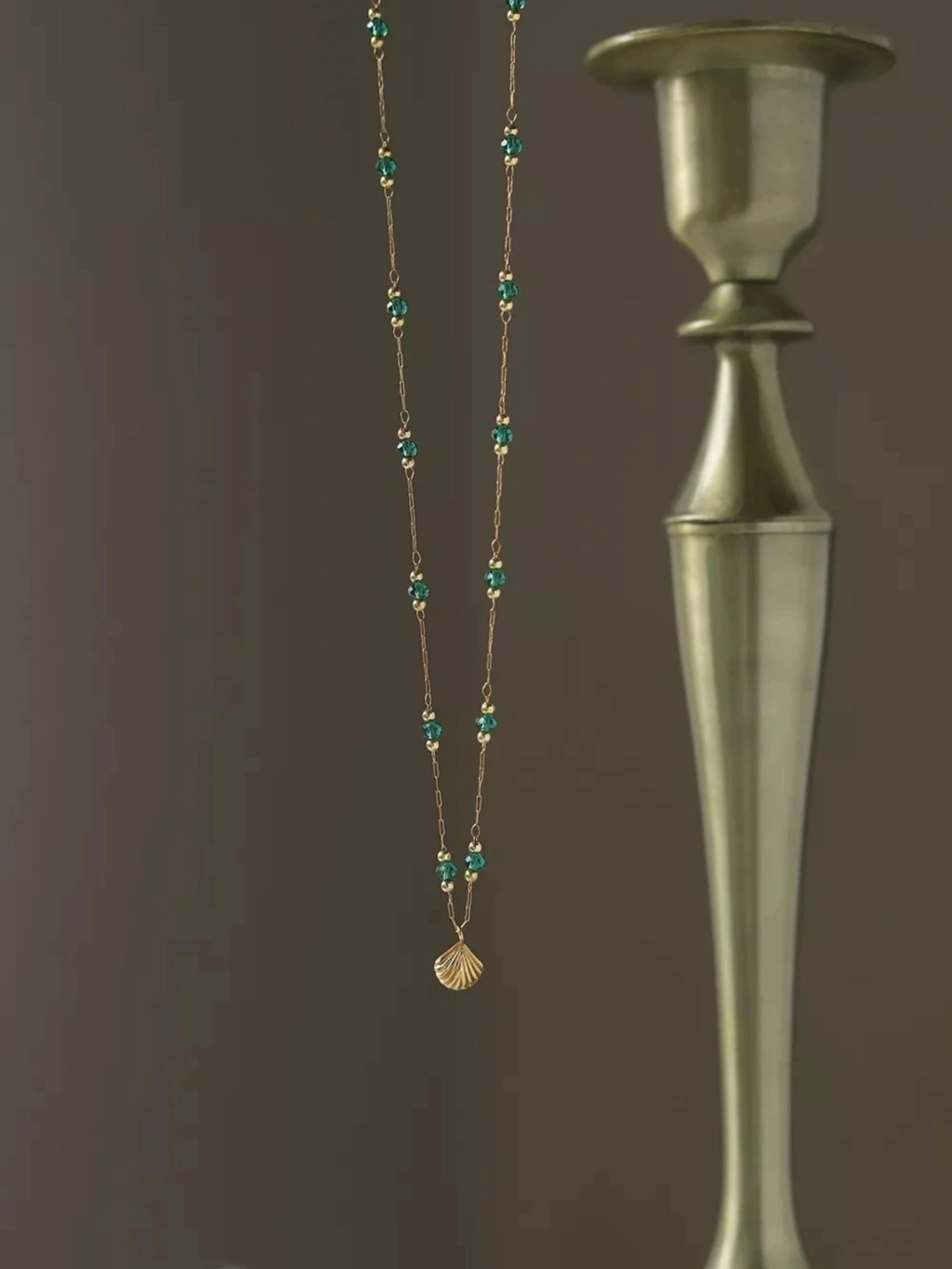 Corrente delicada de elos, com contas redondas verdes de 3mm, e pingente de concha de 7mm.